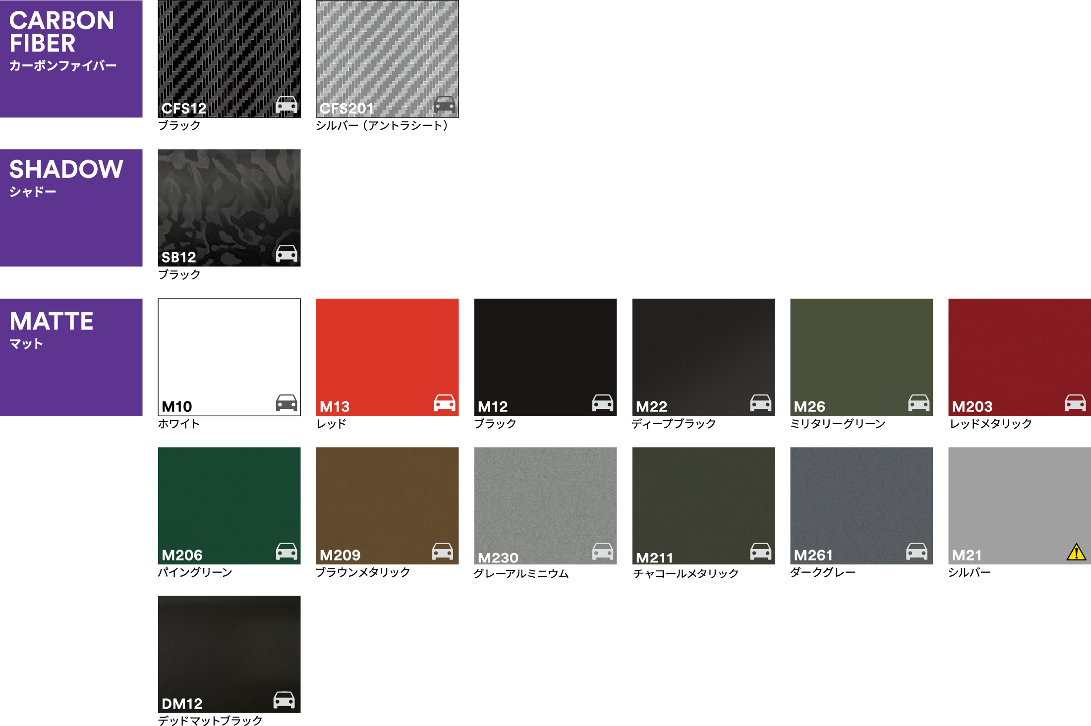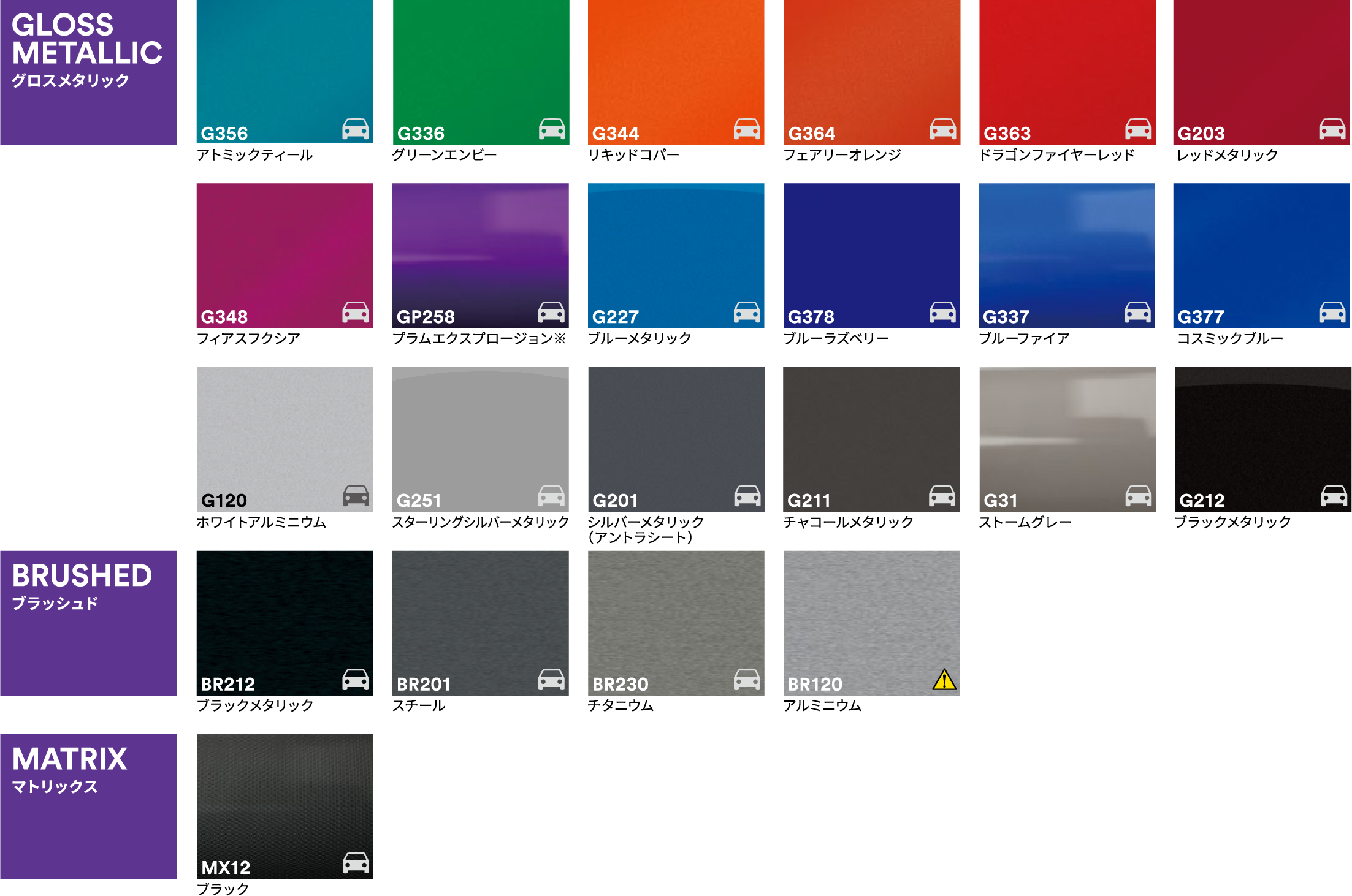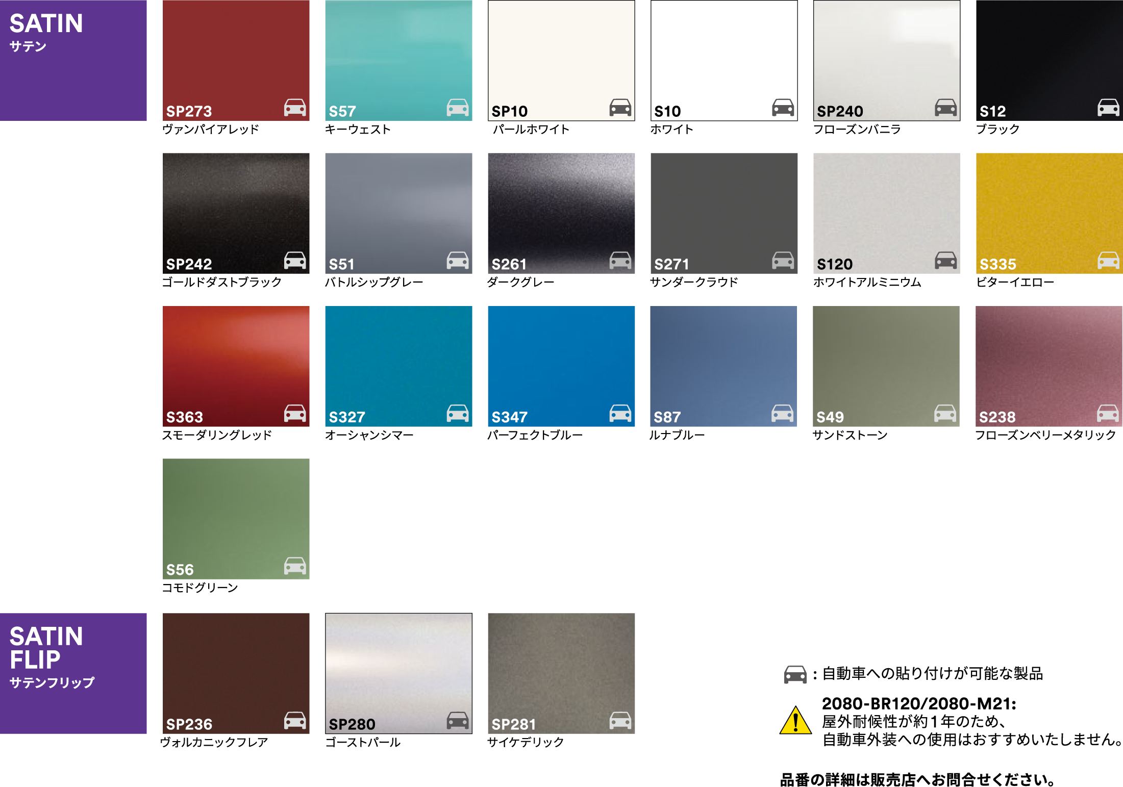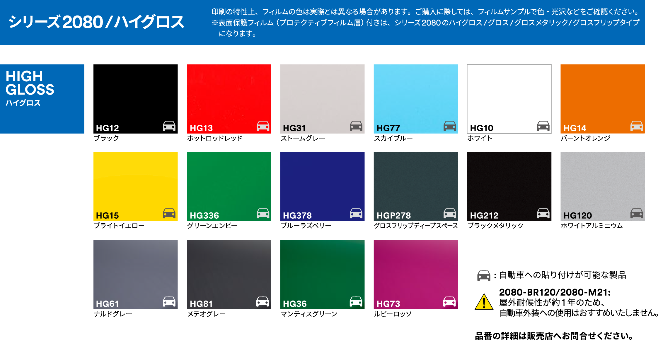 3Mスコッチプリント ラップフィルムシリーズ 1080/2080 乗用車、デジタルガジェットへのラッピングを目的とした装飾用フィルムです。 1524mmのワイド幅によって多くの車種でボンネット等のラッピングが繋ぎ目のない1枚貼りで美しく仕上がります。 さらに、貼り付け(位置合わせ)が容易で、剥離性能に優れた粘着剤を採用しています。 またシリーズ2080では、新たにグロス/グロスフリップタイプの表面に保護フィルム(プロテクティブフィルム層)を付与。 施工時の傷つきやロール時の表面押し跡を抑制すると同時に、グロスの光沢を保ち美しい仕上がりを実現します。 【製品の特長】 ■2次・3次曲面に追従する柔軟なフィルム 曲面の多い乗用車やデジタルガジェットの貼り付け面へフィットする柔軟性があるので、シワになりにくく美しく仕上がります。 ■高い下地隠ぺい性 フィルム本来の発色を実現する下地隠ぺい性があり、貼り付け面の色が透けません。 ■貼り付け作業が簡単 貼り付け時に位置合わせが楽にできるコントロールタック™粘着剤とフィルムと下地の間に巻き込んだエアを抜けやすくするコンプライ粘着剤を採用しているので、広い面積や複雑な面への施工がすばやく簡単に行えます。 シリーズ2080について 業界初! 「つけたまま施工可能」な表面保護フィルム層が、グロスの美しい光沢を守ります。 3Mならではのテクノロジーがつまった新しい表面保護フィルム(プロテクティブフィルム層)。 グロスタイプで見られるロール保管時の表面押し跡を抑制します。 また非常に薄いこのプロテクティブフィルム層は、ラップフィルム層同様の大変優れた柔軟性を持ちます。 この柔軟性により、プロテクティブフィルム層をつけたままの状態で温め・伸ばし・巻き込みなどが可能なため、施工時の傷からフィルムを守ります。 プロテクティブフィルム層に守られたグロス表面は光沢が保たれ、美しい仕上がりを実現します。 ※プロテクティブフィルム層は、施工時に必ず剥離してください。 ※表面保護フィルム(プロテクティブフィルム層)付きは、シリーズ2080のグロス/グロスフリップタイプのみになります。
