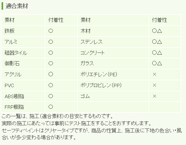 ・塗布面にコート加工などを施している素材は表面を目粗し処理又はプライマー処理などをしてから施工することをおすすめします。