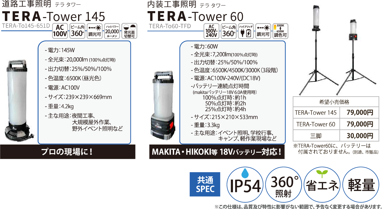 夜間工事や内装工事、倉庫内作業、屋外イベント、学校行事、キャンプなど、「明るさが欲しいけど、大がかりな設備はちょっと…」そんな声に応える、頼れるライトが誕生しました。 TERA-Towerは、プロの現場でも活躍できる高性能を備えながら、 軽量・コンパクト設計に加え取っ手付きのため、使いたい場所への持ち運びも設置も簡単。 360°全方向を照らす広範囲照射と、省エネ性能を両立したLEDタワーライトです。 直置きでの使用や、専用三脚を用いてより広範囲を照らすことが可能です。 製品ラインナップは用途に応じて2種類! 最大20,000lmの圧倒的な明るさで、夜間工事や大規模な屋外作業を強力サポート。 3段階の調光切替(25%/50%/100%)で、現場に合わせた明るさの調整が可能。 AC100V対応(ケーブル長さ3m)で、電源さえあればすぐに使える即戦力モデルです。 サイズはよりコンパクトながら最大7,200lmの明るさを実現。 色温度は昼光色(3000K)・昼白色(4500K)・電球色(6500K)の3段階切替で、シーンに応じた使い分けも自由自在。 AC電源(ケーブル3m)に加え、最大の特長としてmakita製18Vバッテリーにも対応しており、電源のない場所でも安心して使えます。 (※バッテリー別売になります。バッテリーとセット販売も可能です) *上記の仕様は、品質及び特性に影響が出ない範囲で、予告なく変更する場合があります。 どちらのモデルも、IP54の防塵・防滴性能を備え、屋外使用も安心。 軽量設計で持ち運びやすく、設置もスムーズ。 360°照射で、影をつくらず、作業効率もアップ! 現場のプロも納得の明るさと使いやすさ。 TERA-Towerが、あなたの作業環境をもっと快適に、もっとスマートに変えていきます。 発売は2026年4月予定。 ぜひこの機会に、次世代の光を体感してください!