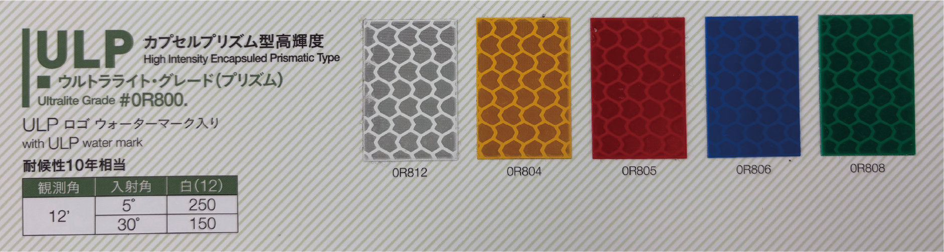 | 製品名: | カプセルプリズム型高輝度 再帰反射シート(ULP) 1220mm×30M / 屋外耐候10年相当 |