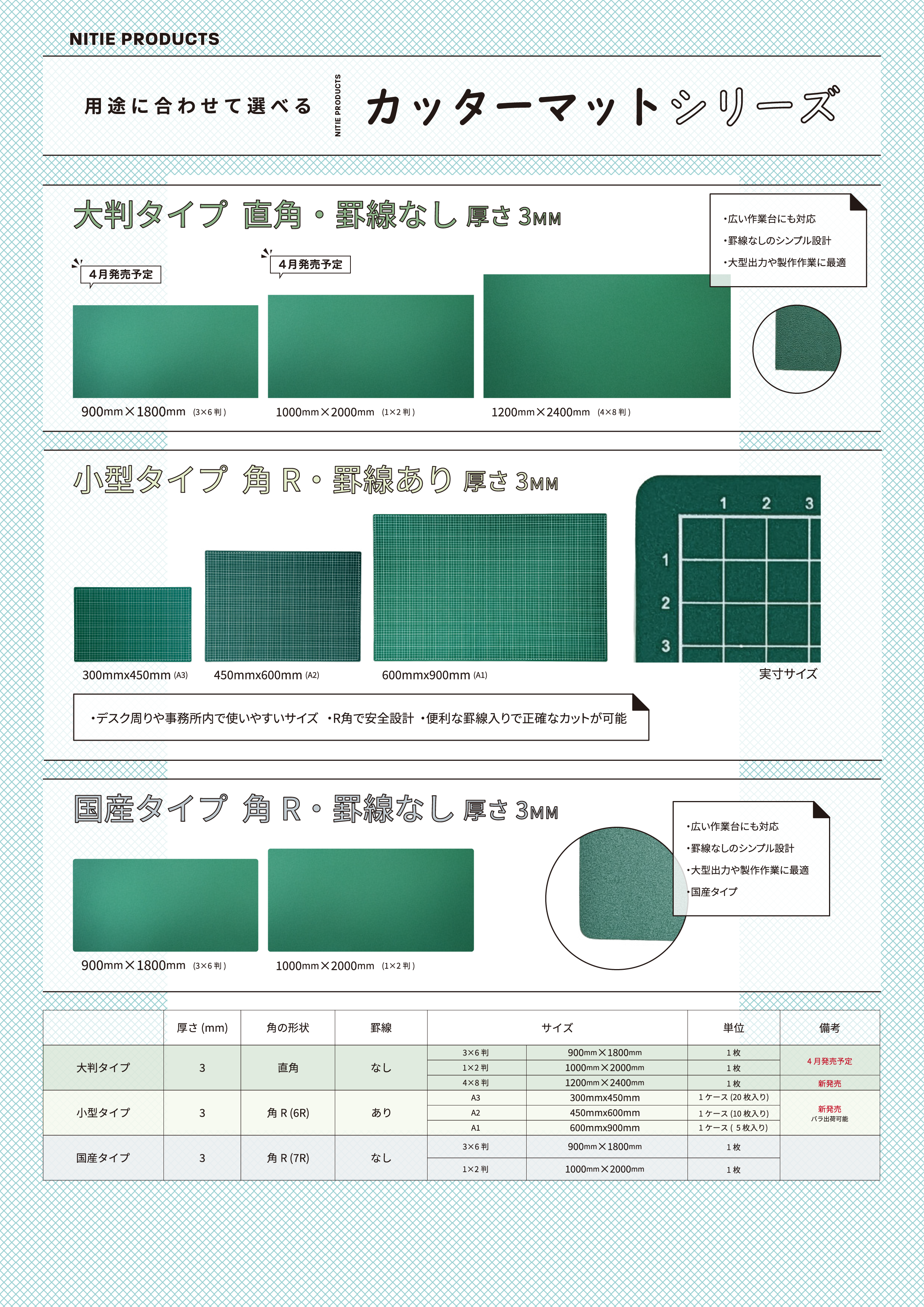 カッターナイフで紙やメディアなどを切断する際に、直接机の上に置いて作業をするとカッターの刃が机に当たり、机を傷つけてしまいます。 そのため、机の上にカッターマットを敷いてその上で作業をすることで、机に傷がつくのを防ぎます。 1枚あると便利です。 【特徴】 使いやすいカッターマットです。 【商品詳細】 素材:塩ビ 色:罫線入り緑色 その他:4つ角R付き(6R) 【注意点】 塩ビ製品に付き、寸法公差が±5mm程度あります。 北海道・沖縄・離島は別途運賃になります。