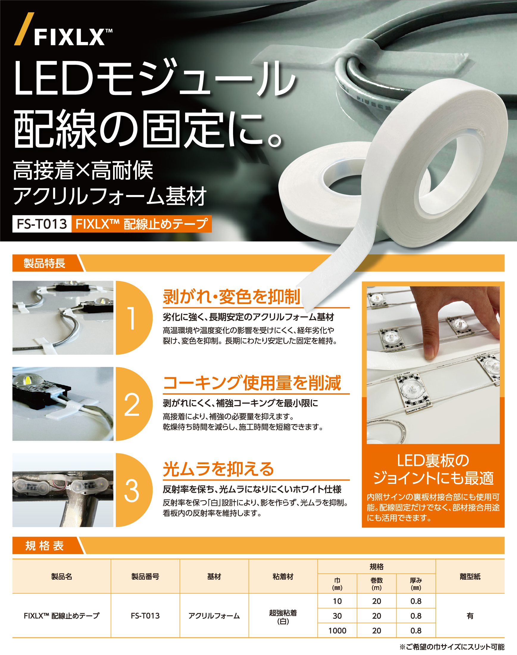 ~LEDモジュール配線の固定に~ これまでLEDモジュールの配線を止める際に ユーザー様によりバラバラで統一した商品は特になく… 最も多いのがフックにひっかけるタイプやコーキングでの施工でした。 しかし、フックは配線が外れるリスクがあり浮いてくると内照看板だと線の部分が影が出てしまいます。 コーキングの場合だと乾燥するまでの時間がかかり作業効率が落ちてしまうというデメリットがあります。 そこでこのFIXLX 配線止めテープ(FS-T013)であれば、上記のストレスを解消するだけでなく作業効率も上がり反射率を保てるので光ムラも抑えられます。 この機会にぜひともご検討いただけたらと思います。 配線止めテープ(FS-T013) LEDモジュール配線の固定に! 高接着 × 高耐候 アクリルフォーム基材 【製品特徴】 1,剥がれ・変色を抑制 劣化に強く、長期安定のアクリルフォーム基材 高温環境や温度変化の影響を受けにくく、経年劣化や裂け、変色を抑制。 長期にわたり安定した固定を維持。 2,コーキング使用量を削減 剥がれにくく、補強コーキングを最小限に 高接着により、補強の必要量を抑えます。 乾燥待ち時間を減らし、施工時間を短縮できます。 3,光ムラを抑える 反射率を保ち、光ムラになりにくいホワイト仕様 反射率を保つ「白」設計により、影を作らず、光ムラを抑制。 看板内の反射率を維持します。 【規格表】 製品名:FIXLX配線止めテープ 型番:FS-T013 基材:アクリルフォーム サイズ例: 幅(mm):10 / 30 / 1000 長さ(m):20 厚さ(mm):0.8 ※ご希望のサイズにスリット可能です。