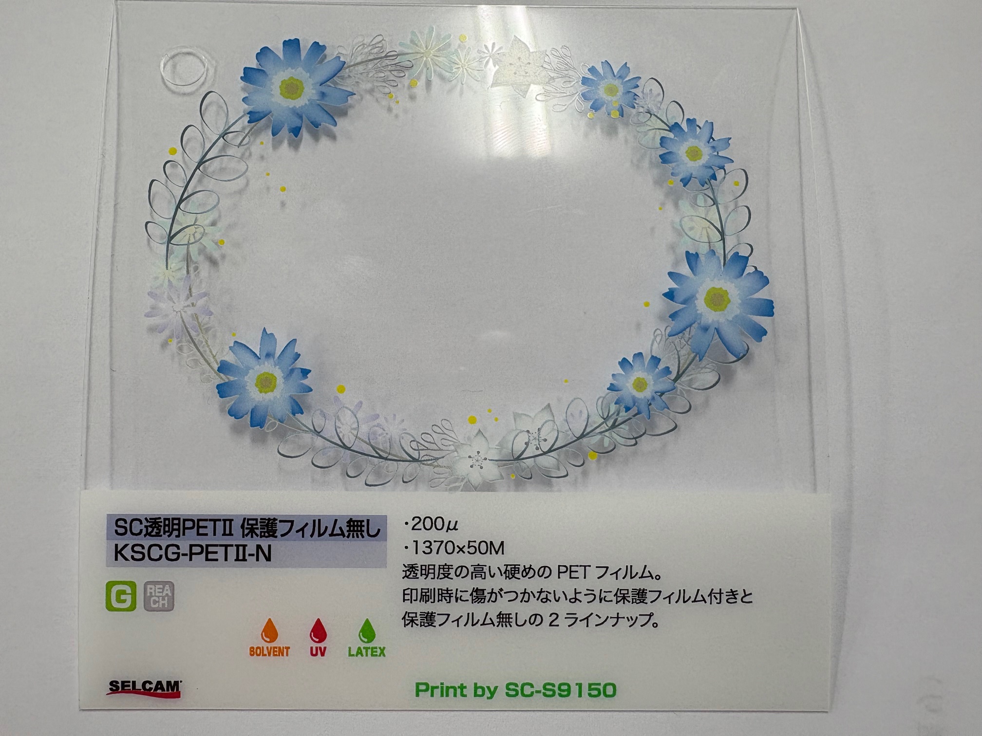 透明度の高い硬めのPETフィルム。 印刷時に傷がつかないように保護フィルム付きと保護フィルム無しの2ラインナップ。 【製品仕様】 サイズ:1,370 mm × 50m 紙管:3インチ 基材:ポリエチレンテレフタレート 厚み:200μ 対応インク:溶剤 / UV / Latex(ラテックス) 耐候性:屋内用 【特徴】 ・基材に透明PETを使用したディスプレイ用途に最適なフィルムです。 ・基材にPETを使用しており、基材の収縮が殆どありません。 ・乾燥性、発色性に優れ各種プリンターへの適応が可能です。