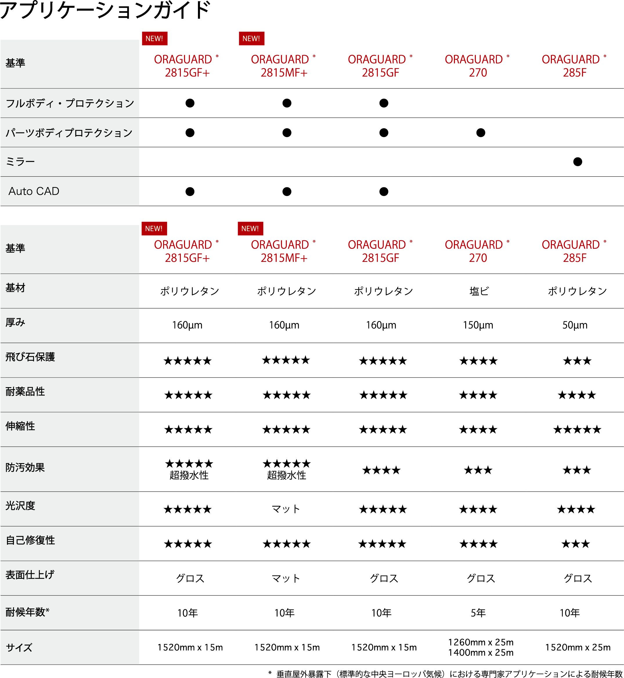 ■ORAGUARD Stone Guard Films 最適な素材で愛車を守りませんか? 高透明で超撥水性を有するORAGUARDペイントプロテクションフィルムは、 デリケートな自動車塗装面の理想的な表面保護ソリューションです。 車のボディパーツを飛び石等から効果的に保護するために特別に設計されています。 ■ORAGUARD 2815 series ・飛び石等に対する優れた塗装保護ソリューションです。 ・高透明で塗装色を引き立てます。 ・耐久性と耐衝撃性に優れています。 ・自己修復機能が優れています。 ・車の外装を最長10年間きれいな状態に保つように設計されています。 ・超撥水トップコート(ロータス効果)を有する2815GF+(グロス)と2815MF+(マット)があります。 新しいORAGUARD2815シリーズは、ほとんどの従来のプロッターシステムで簡単にカットでき、便利なプレカットができます。 愛車の最も傷つきやすい部分を保護する - 代表的な範囲 - ORAFOLペイントプロテクションフィルムは高透明なので、フルラッピングだけでなく部分的なラッピングにも使用できます。 つまり、車の最もダメージの危険性がある部分にだけ施工することができます。
