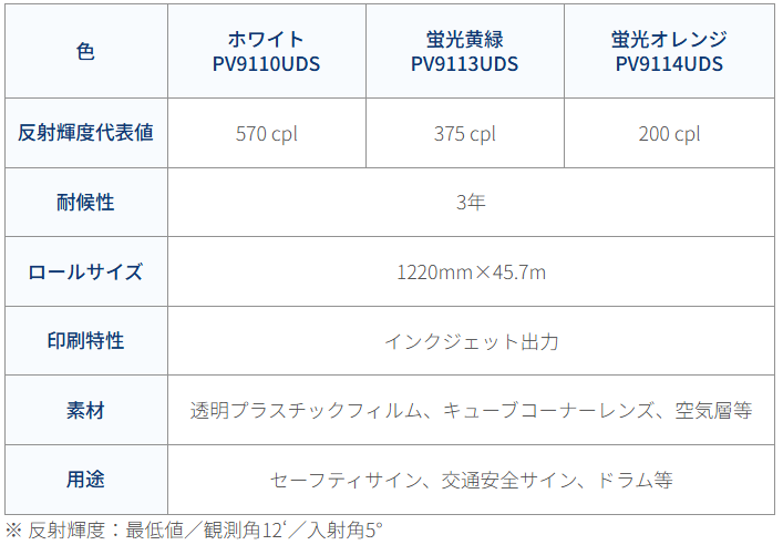 UV硬化型インクジェットプリンタ、ラテックスインクジェットプリンタ、溶剤インクジェットプリンタ等で印刷が可能な裏面に感圧型接着剤が塗布された再帰性反射プリズムシートです。 シート内部に高密度のキューブコーナー反射素子を配し、入射光を光源方向に反射する再帰性反射シートです。 特に輝度が高く、ヘッドライト等を受けて明るく輝き、また広角性に優れ、夜間の安全確保等に活用できます。 蛍光色は、昼間(特に薄暮時)の視認性をより高めています。 ■製品の特長 ・シート内部に高密度のキューブコーナー素子を配し、ほぼ100%の反射面を実現 (従来のプリズム型三面体キューブは60%程度) ・ 蛍光色で薄暮時、曇天時にも一般色より高い視認性を実現 ■プリズム型反射シートの構造 プリズム型反射シートは特殊なキューブコーナーレンズで、入射光を光源方向に反射する再帰性反射シートです。 ■製品情報 ■ファブリケーションラインについて プリズム型反射シートには流れ方向に一定の間隔で、1mm程のファブリケーションライン(つなぎのライン)があります。 (PX8400UDSシリーズの場合1370mm間隔) ファブリケーションラインは、シートの製造工程上発生するものです。 【サンプルのご依頼について】 こちらはA5サイズ程度のサンプルのご用意が可能です。 ご依頼に関しては順次、対応致します。 サンプルに関しては納期のご連絡や送り状No,のご連絡などは行っておりません。 何卒ご了承頂ければと思います。 ※切り売りの場合は1梱包送料全国¥1,800-(税抜き:沖縄・離島を除く)になります。