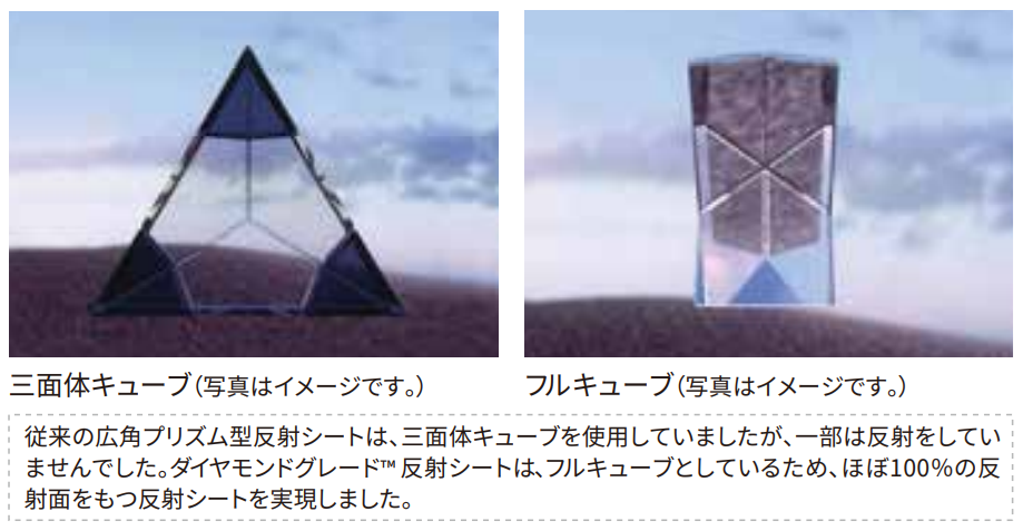 ・シート内部に高密度のキューブコーナー素子を配し、ほぼ100%の反射面を実現