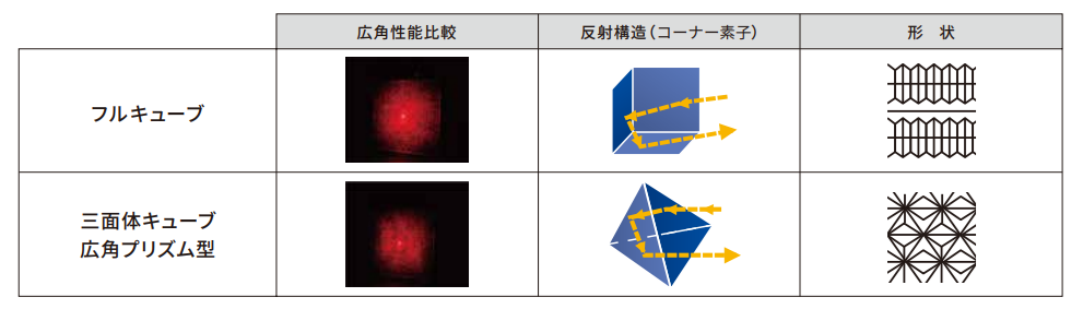 プリズム型反射シートは特殊なキューブコーナーレンズで、入射光を光源方向に反射する再帰性反射シートです。