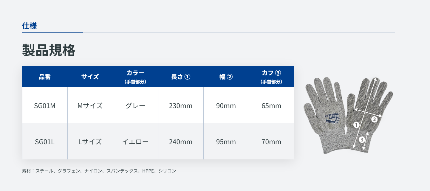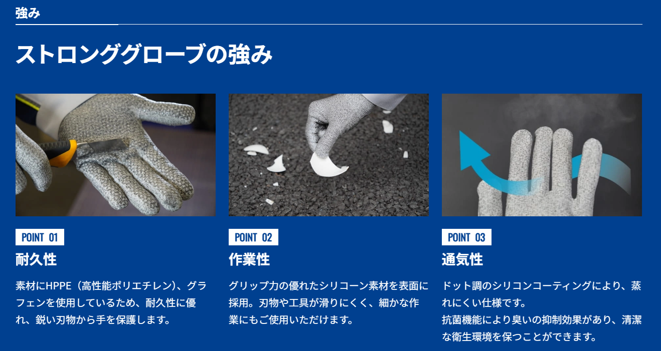 「ストロンググローブ」は、刃物やガラス等の切り傷や作業中の怪我から手を保護する、耐切創手袋です。