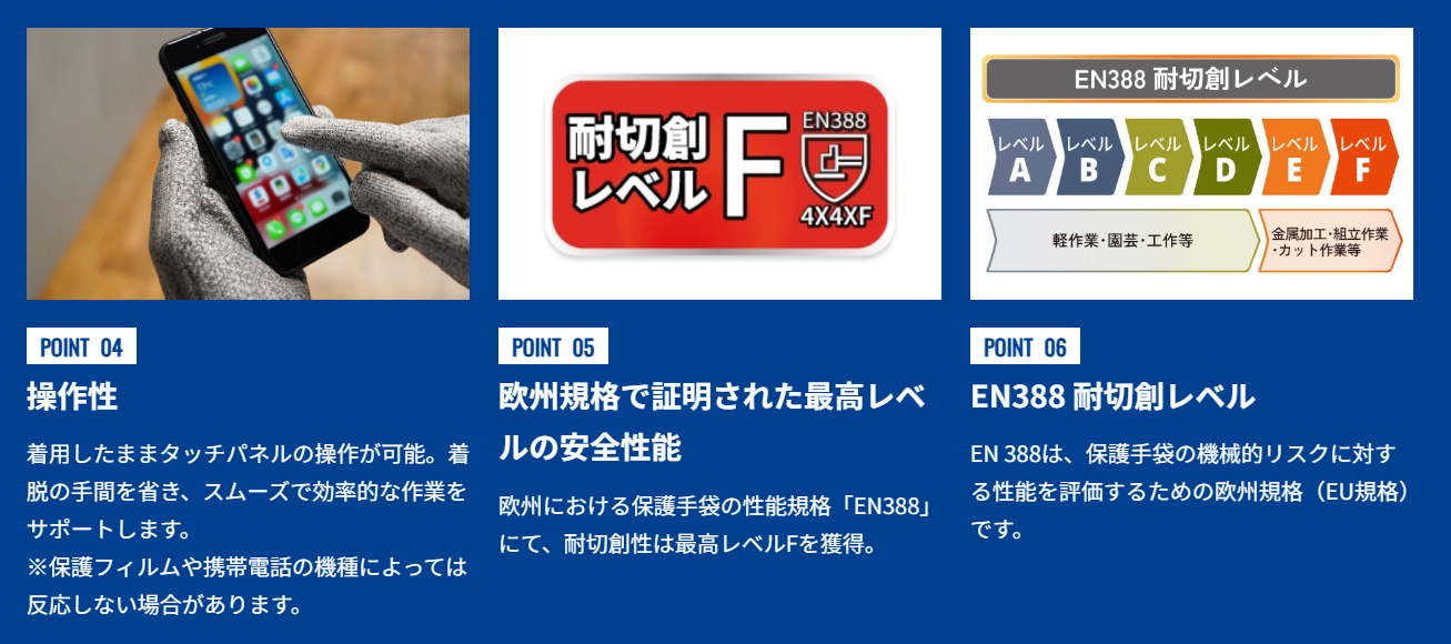 欧州における保護手袋の性能規格「EN388」にて、耐切創性は最高レベルFを獲得。