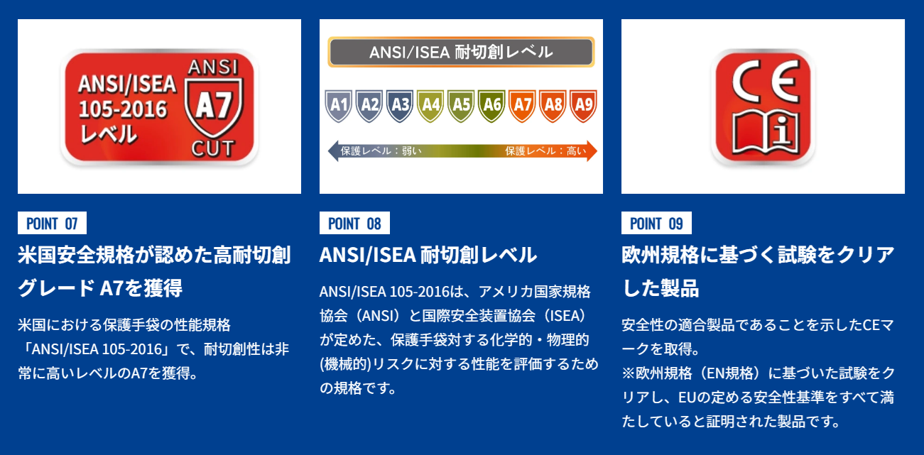 米国における保護手袋の性能規格「ANSI/ISEA 105-2016」で、耐切創性は非常に高いレベルのA7を獲得。